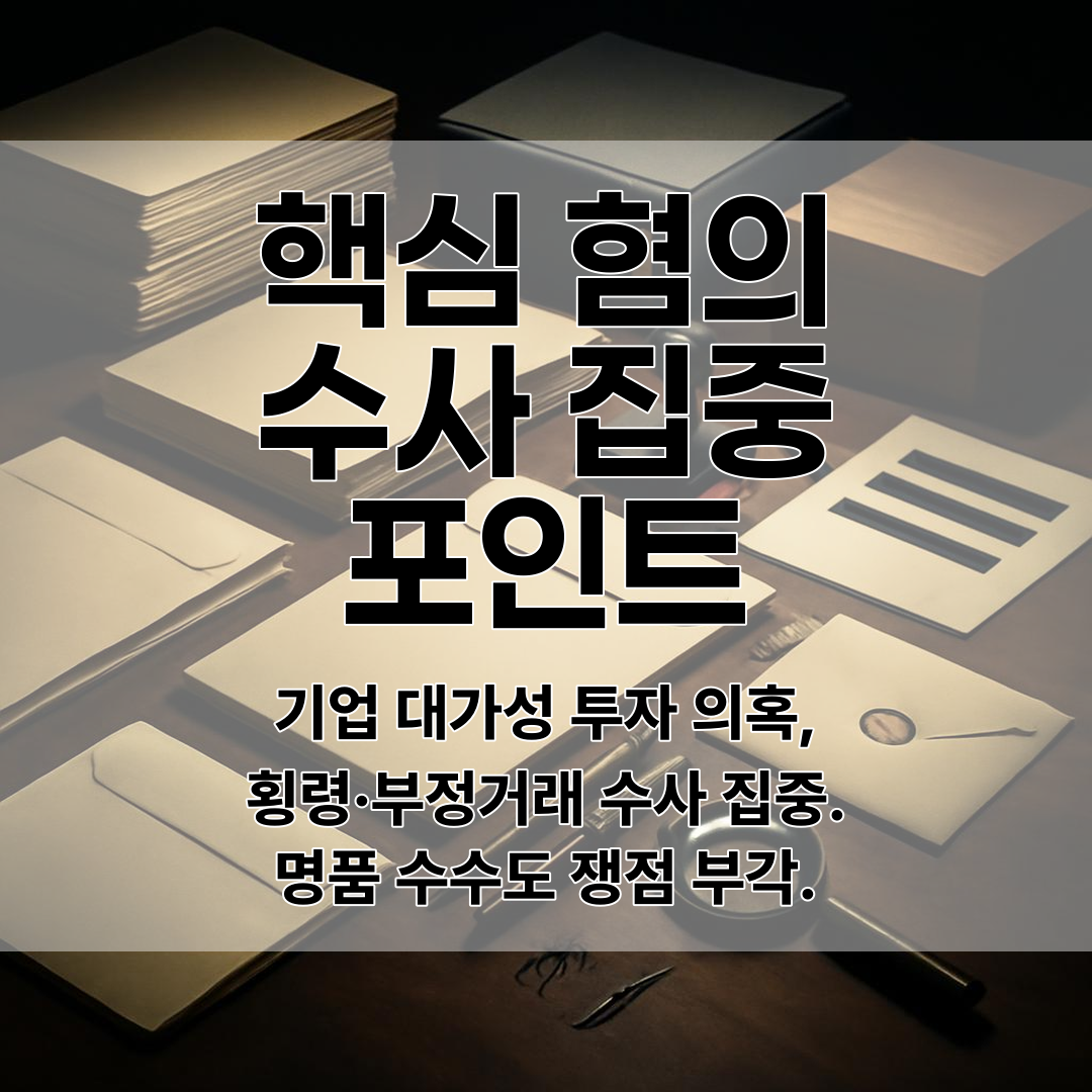 ⏺ 기업 대가성 투자 의혹, 횡령·부정거래 수사 집중. 명품 수수도 쟁점 부각.
