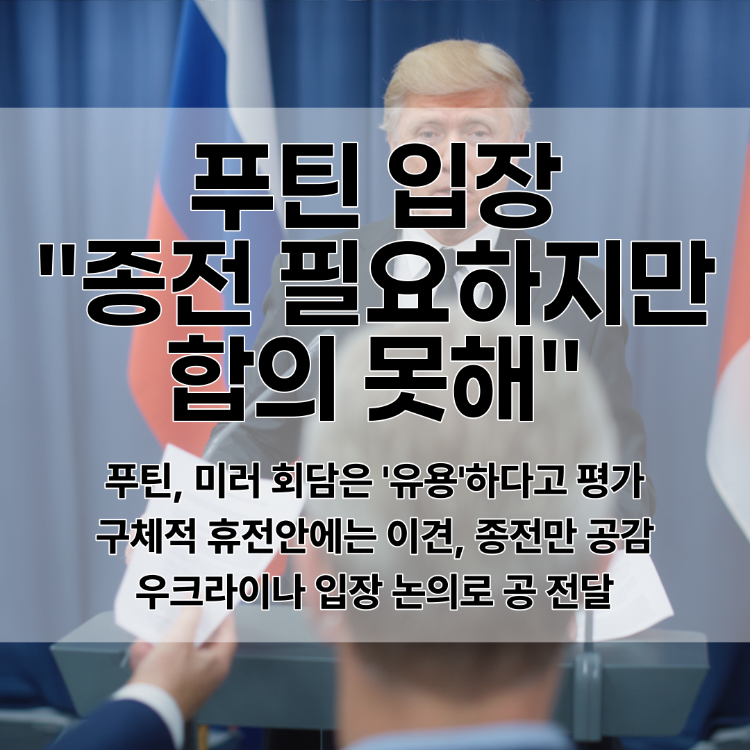 - 푸틴, 미러 회담은 '유용'하다고 평가 구체적 휴전안에는 이견, 종전만 공감 우크라이나 입장 논의로 공 전달