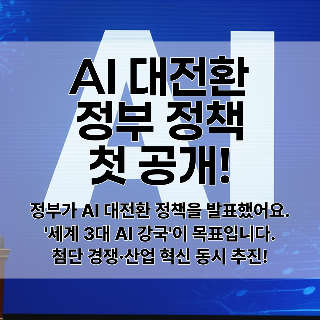 - 정부가 AI 대전환 정책을 발표했어요. '세계 3대 AI 강국'이 목표입니다. 첨단 경쟁·산업 혁신 동시 추진!