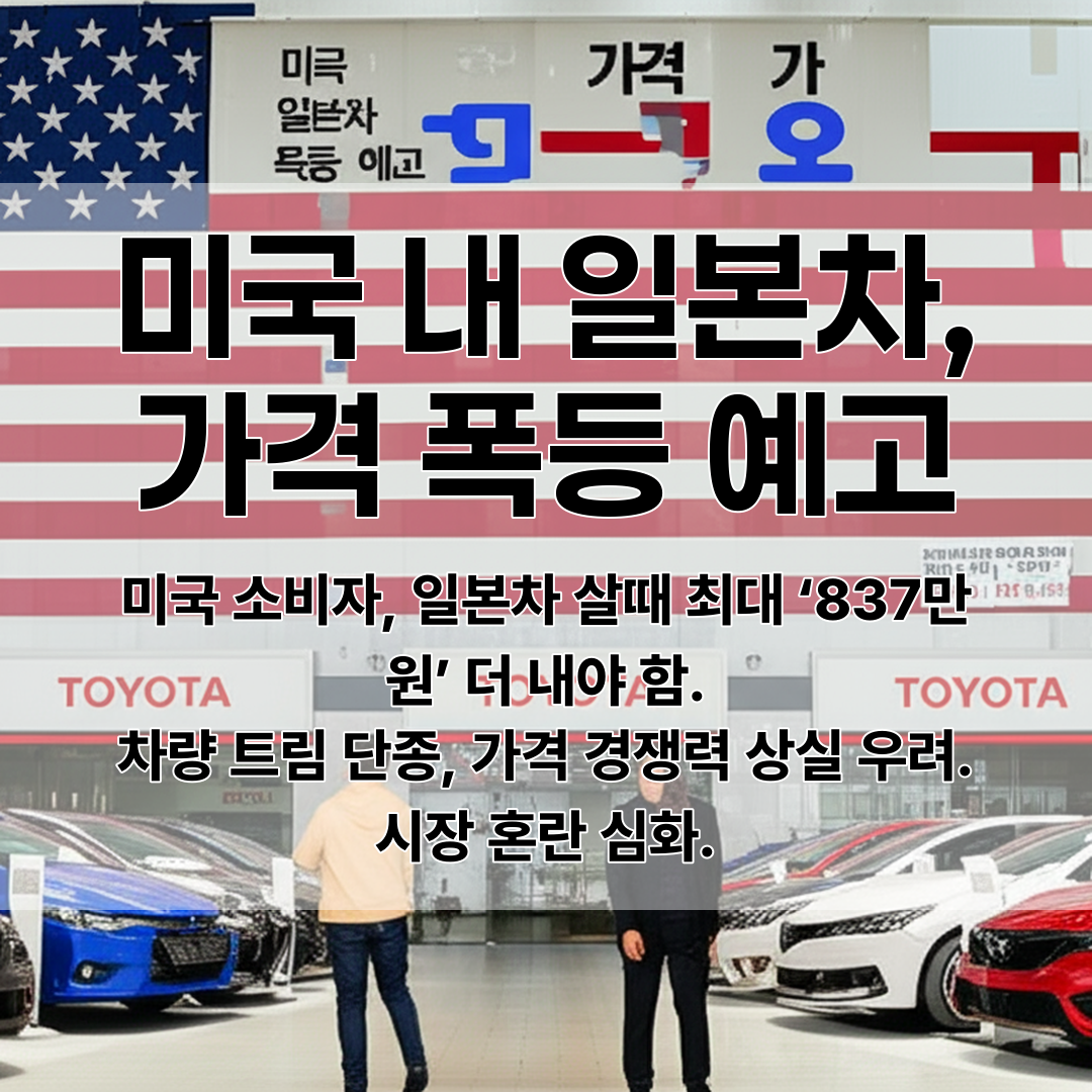 미국에서 판매되는 일본 브랜드 차량이 관세로 인해 최대 837만 원까지 오를 수 있다며, 업계는 가격 경쟁력 상실을 걱정한다. 전문가들은 일부 차량 트림이 단종될 수도 있고, 시장점유율이 급락할 가능성도 우려.