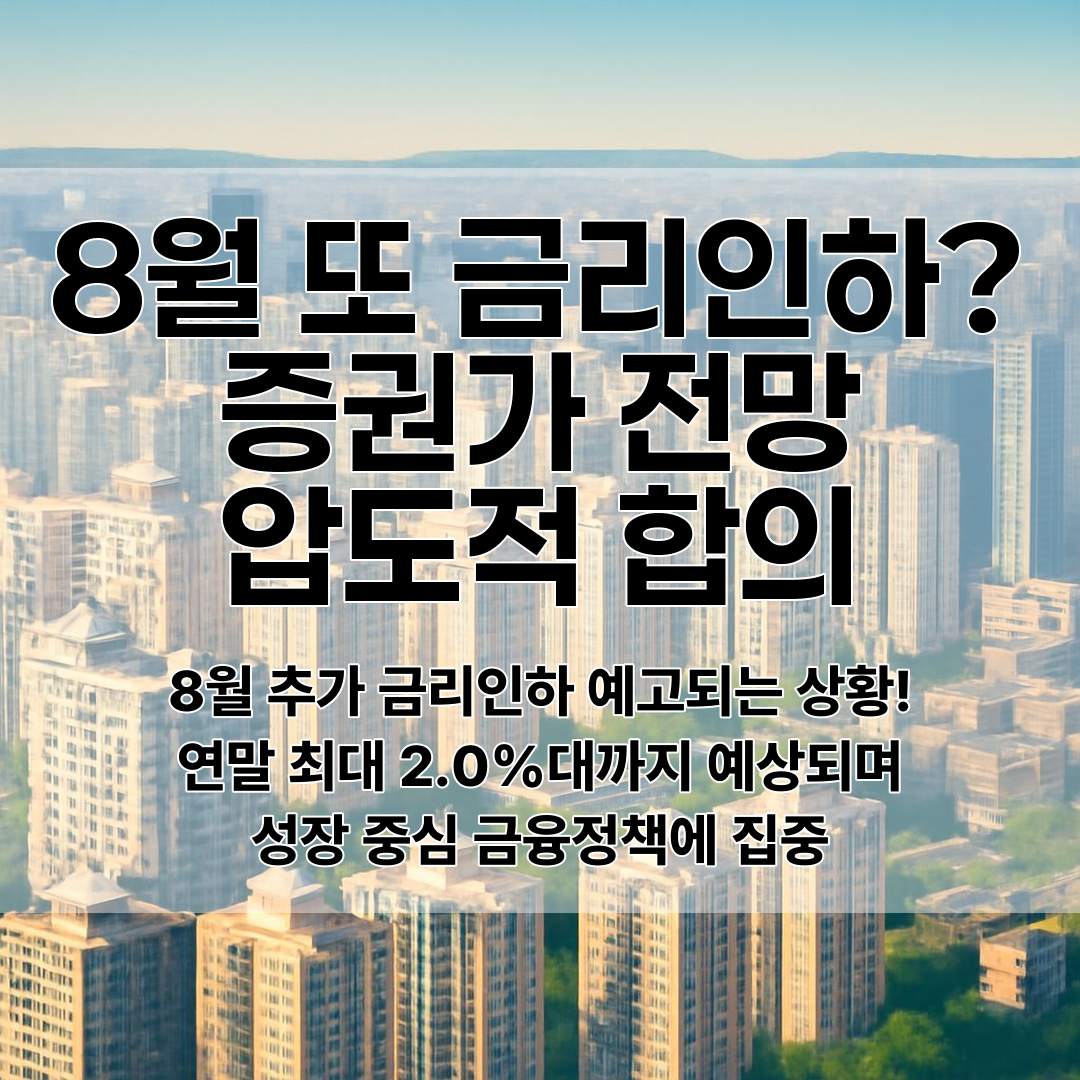 2025년 8월 한국은행의 추가 기준금리 인하가 거의 기정사실화되고 있어요. 증권업계 전문가들은 올해 8월과 11월 각각 한 차례씩 더 내릴 것으로 전망하며, 연말에는 2.0%~2.25% 수준까지 떨어질 것으로 예상하고 있습니다.