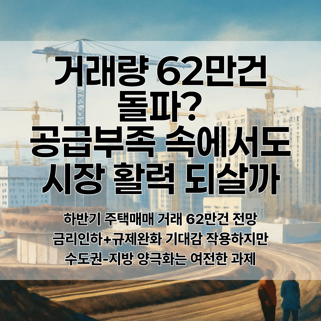 2025년 하반기 주택 매매 거래가 최대 62만 건을 넘을 것으로 전망된다. 금리 인하와 일부 규제 완화 기대감이 작용하고 있으나, 수도권과 지방의 양극화 현상과 신규 주택 공급 부족 문제는 여전하다.