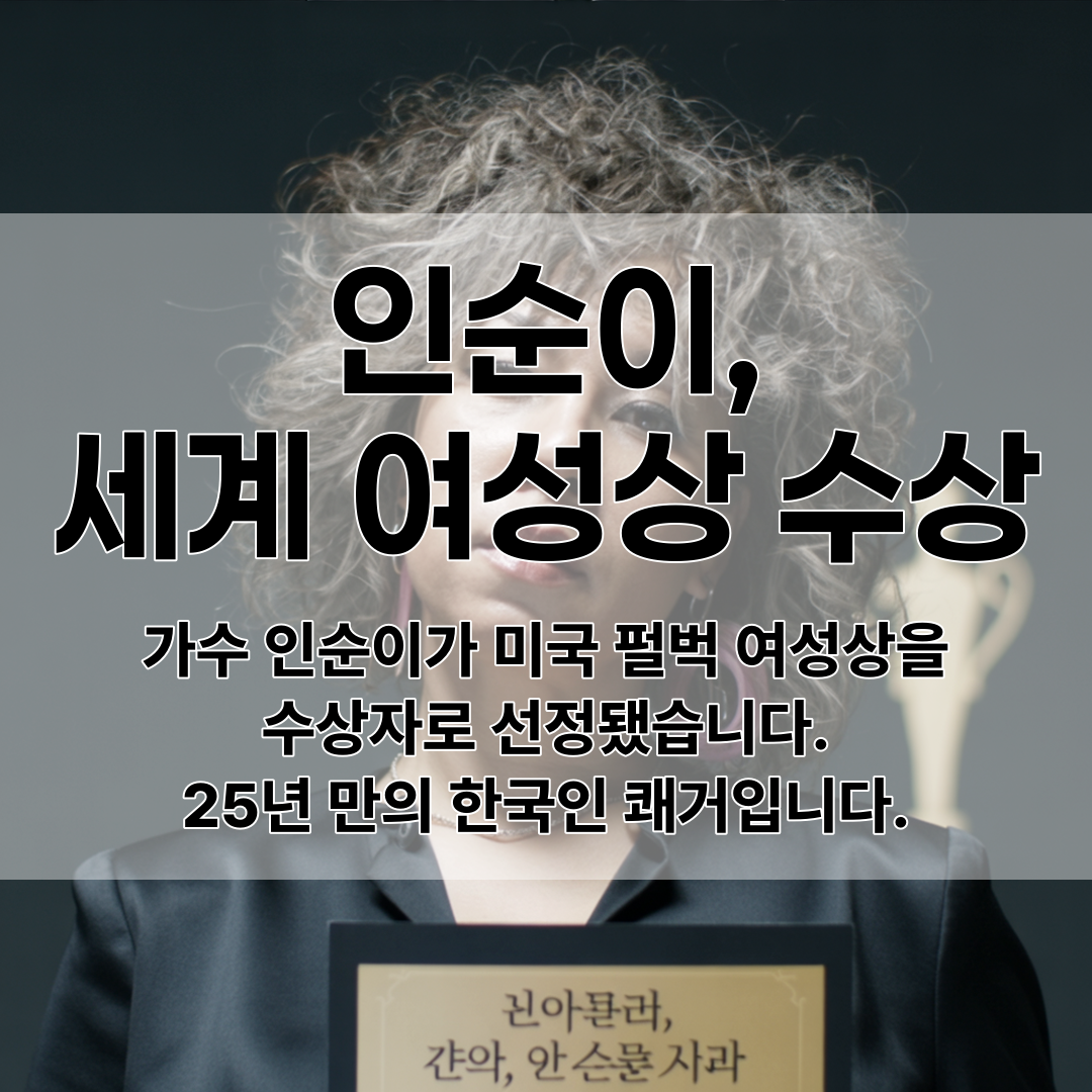 가수 인순이가 2025년 8월 미국 펄벅 인터내셔널의 '영향력 있는 여성상' 수상자로 선정되었으며, 한국인으로는 25년 만에 두 번째 수상자가 되었다.