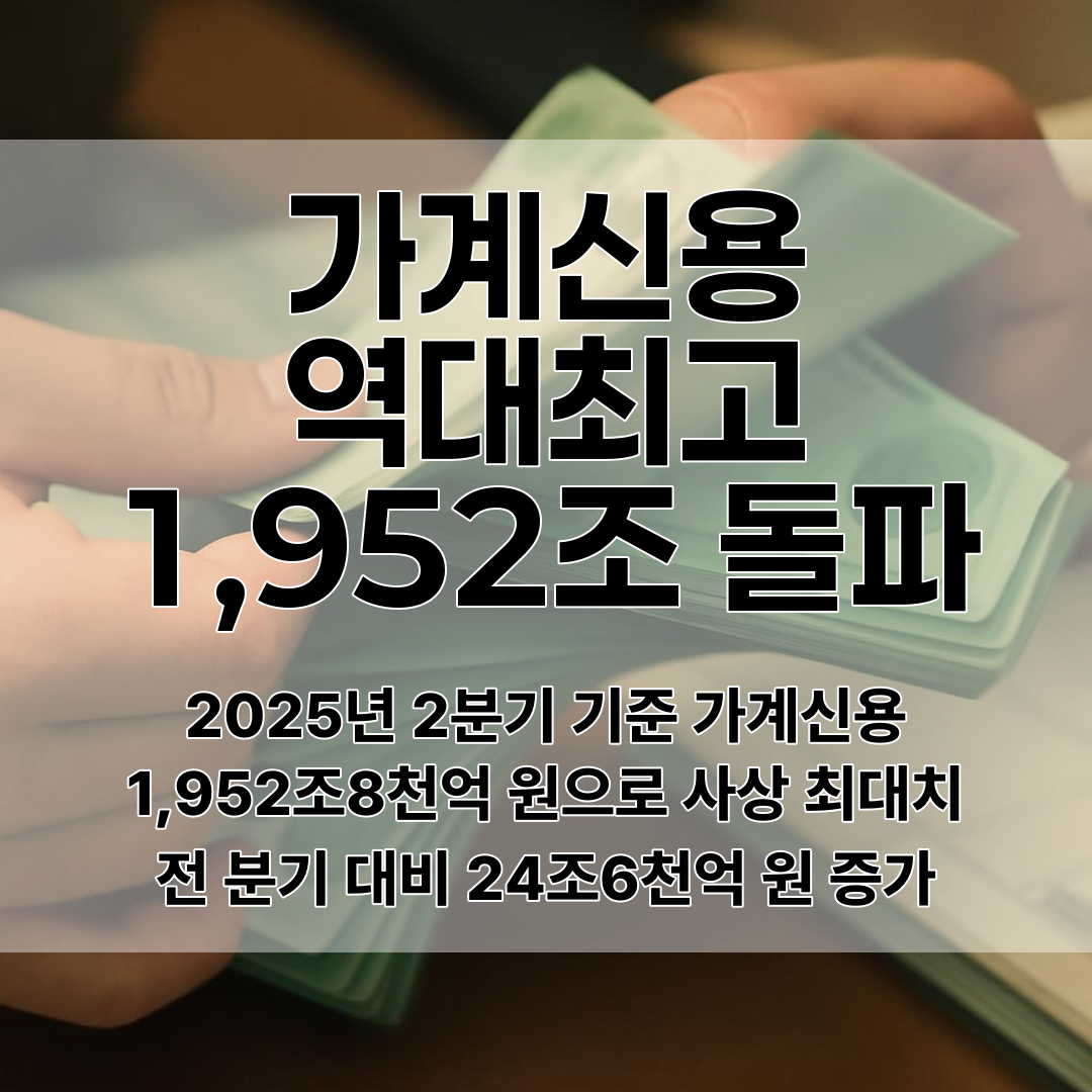2025년 2분기 기준 가계신용이 1,952조8천억 원으로 사상 최대치를 기록했으며, 전 분기 대비 24조6천억 원 증가해 2021년 3분기 이후 분기별 최대 증가폭을 나타냈다.