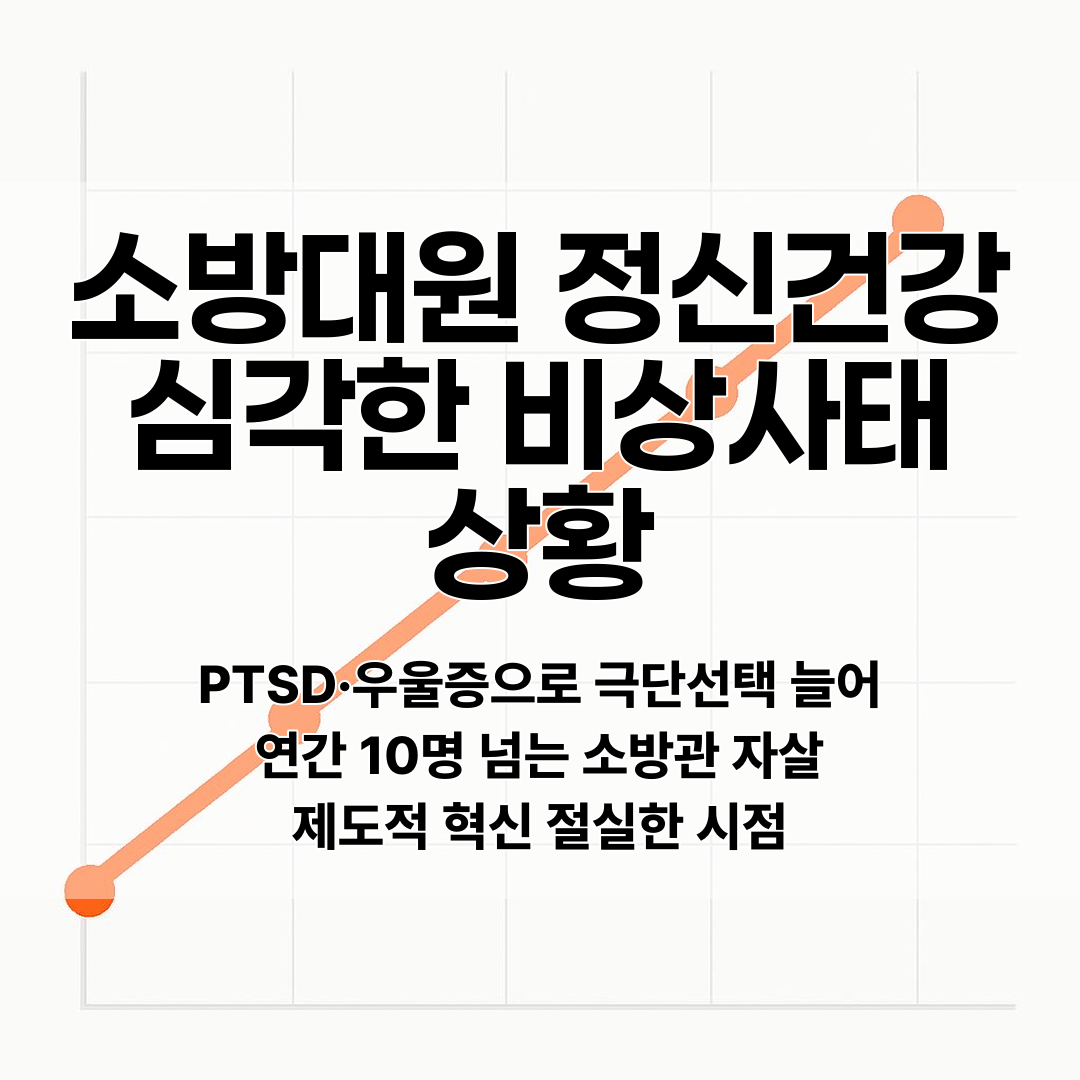 매년 평균 10명이 넘는 소방관들이 극단적 선택을 하고 있으며, 이는 일반인보다 훨씬 높은 수치로 재난 현장 경험으로 인한 트라우마, PTSD, 우울증이 주요 원인으로 분석되고 있다.