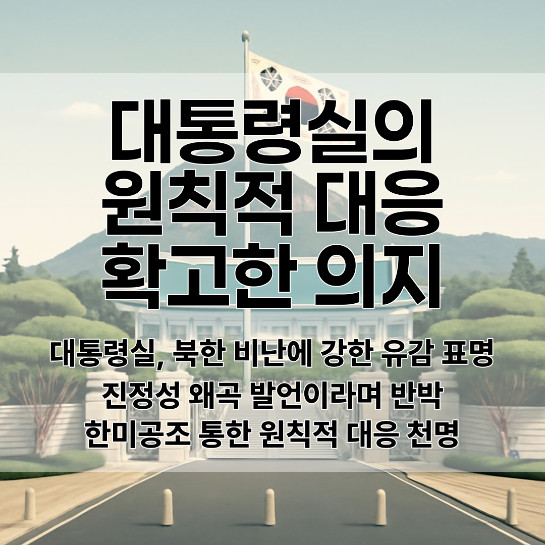 한국 대통령실은 북한의 이재명 대통령 실명 비난에 대해 '진정성 있는 평화 노력을 왜곡하는 것은 매우 유감스럽다'며 강한 유감을 표명하고, 한미 공조와 국제 협력을 통한 원칙적 대응을 천명했다.