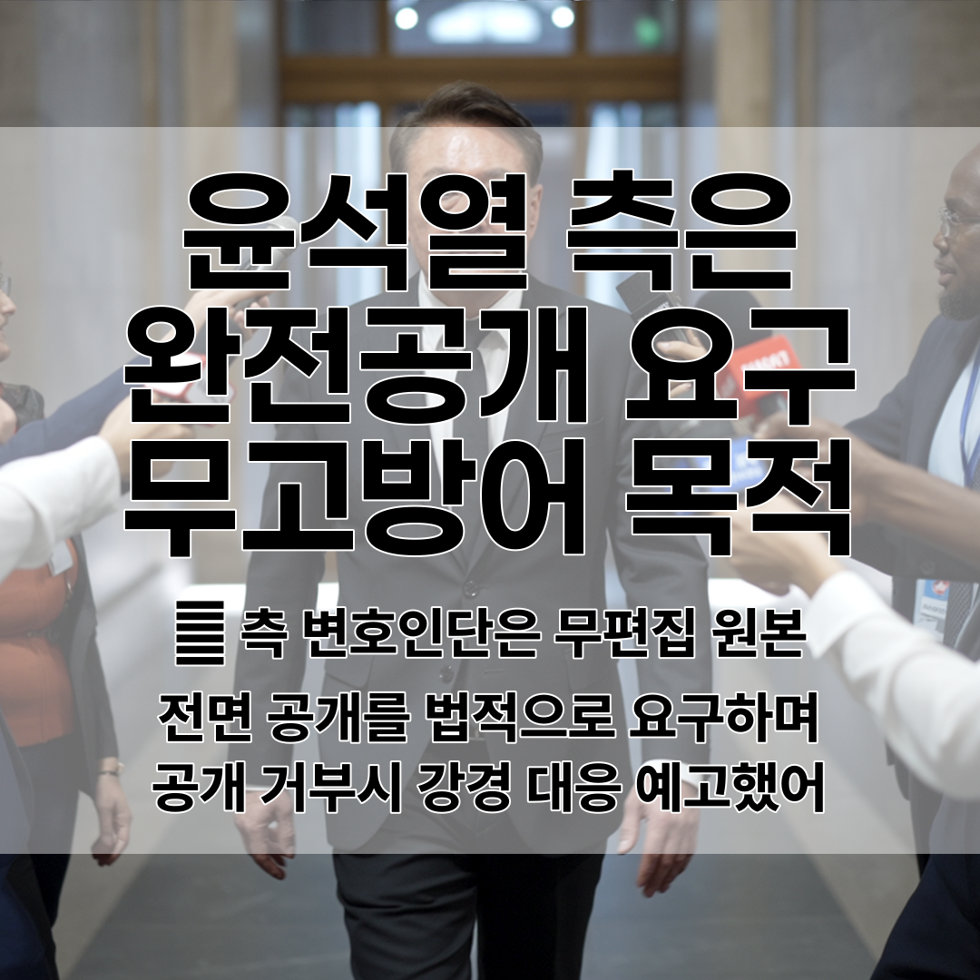 윤석열 전 대통령 변호인단은 무편집 원본 전면 공개를 법적으로 요구하며, 공개 거부 시 증거 인멸 혐의 등을 제기하는 강경 대응을 예고했다.