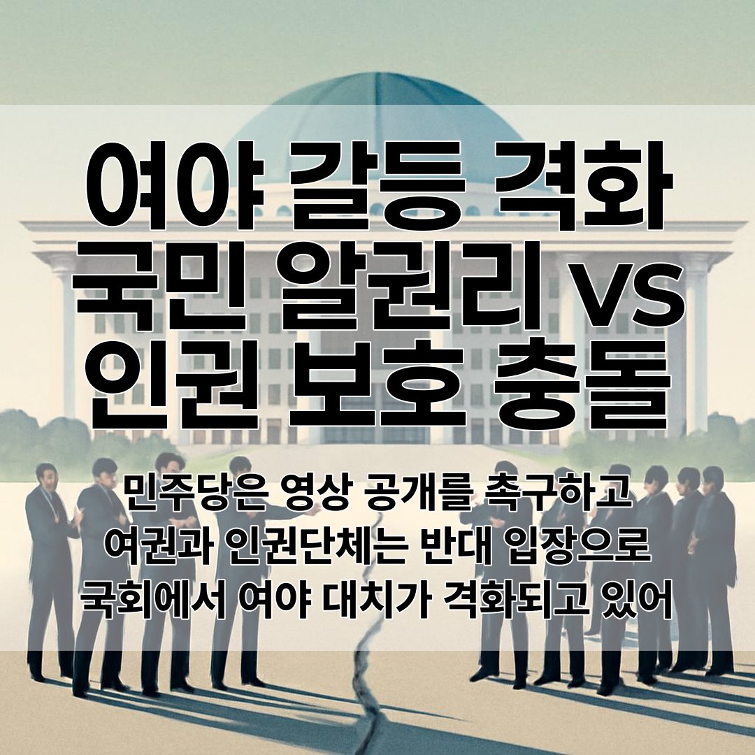 민주당은 국민의 알권리와 대통령의 책임성을 강조하며 영상 공개를 요구하고 있는 반면, 여당과 일부 인권단체는 개인정보 침해 및 절차상 문제를 들어 반대하고 있어 국회에서 여야 대치가 격화되고 있다.