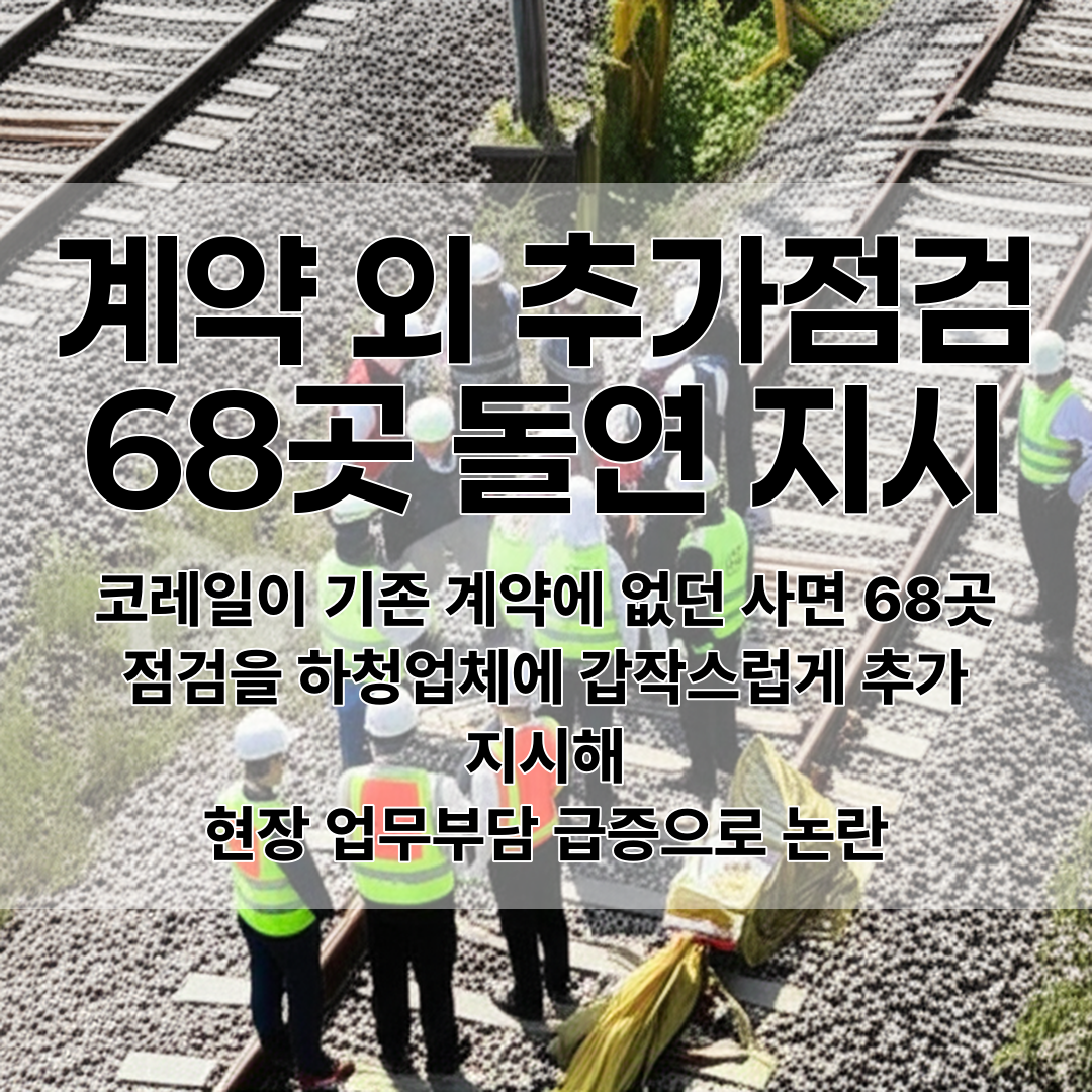 코레일은 원래 계약상 포함되지 않은 사면 68곳의 안전 점검을 돌연 하청업체에 추가로 맡겼어요. 이 과정에서 충분한 기간이나 안전 설계 없이 갑작스럽게 일이 늘어나 현장의 부담이 커진 것으로 업계는 분석했습니다.