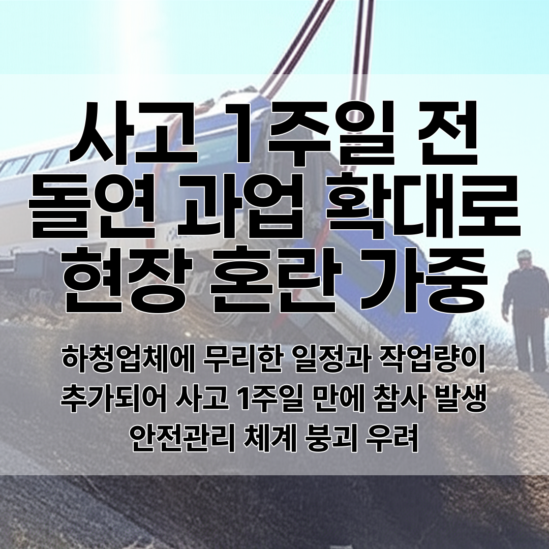 하청업체는 늘어난 업무량을 감당할 수밖에 없어 안전에 소홀할 수밖에 없는 환경이 조성되었어요. 결국 이런 무리한 추가 지시가 사고 원인의 하나로 지목되며, 책임 소재 논란이 거세지고 있습니다.