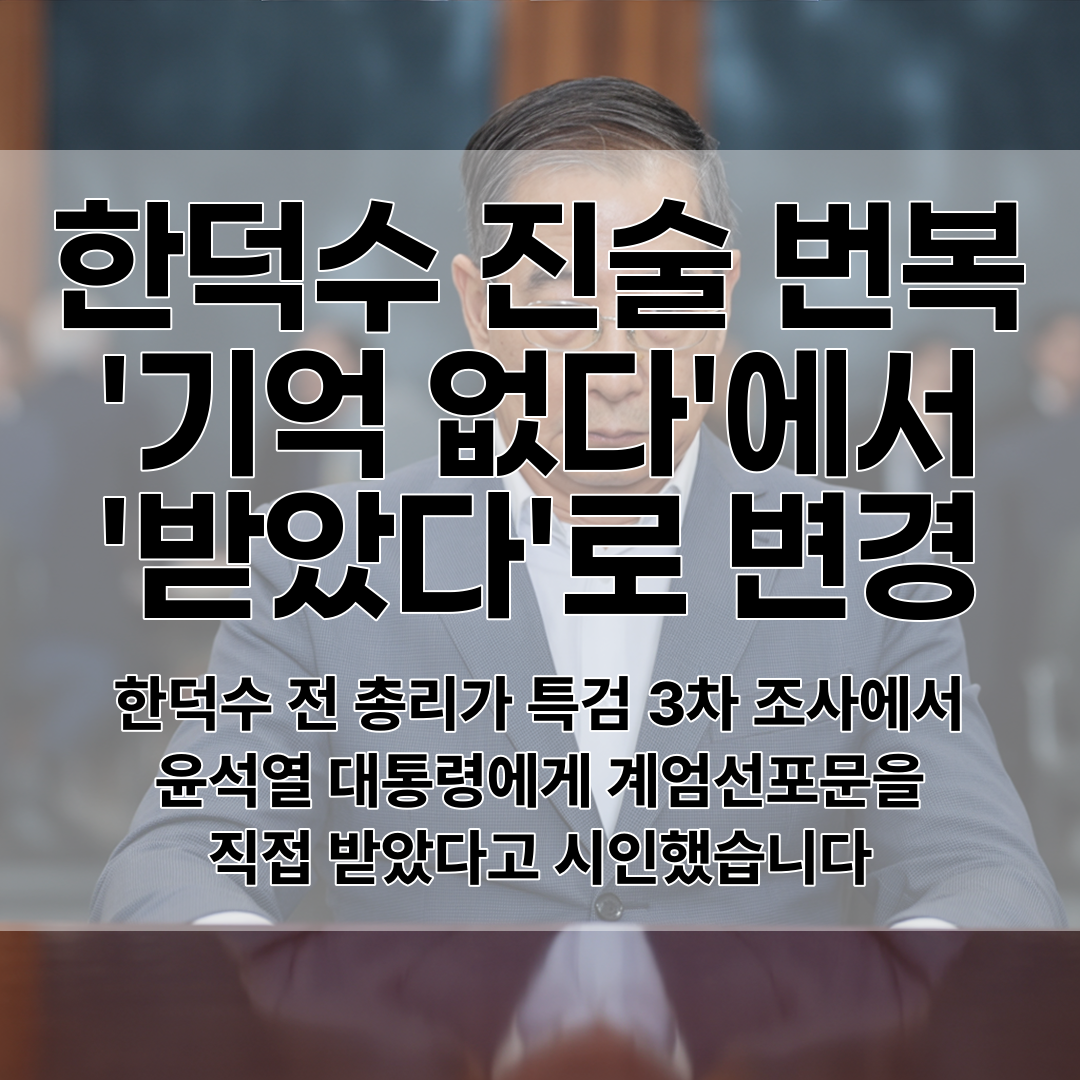 한덕수 전 국무총리가 특검 3차 조사에서 기존 '기억이 없다'는 입장을 번복하여 윤석열 전 대통령으로부터 직접 계엄선포문을 받았다고 시인했다.