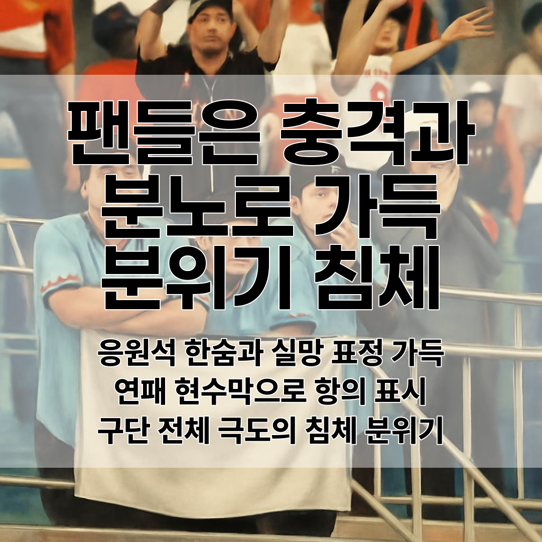 응원석에는 한숨과 실망이 가득하며, 일부 팬들은 연패를 규탄하는 현수막으로 항의 의사를 표현했다. 구단 전체가 극도의 침체 분위기에 빠져있다.