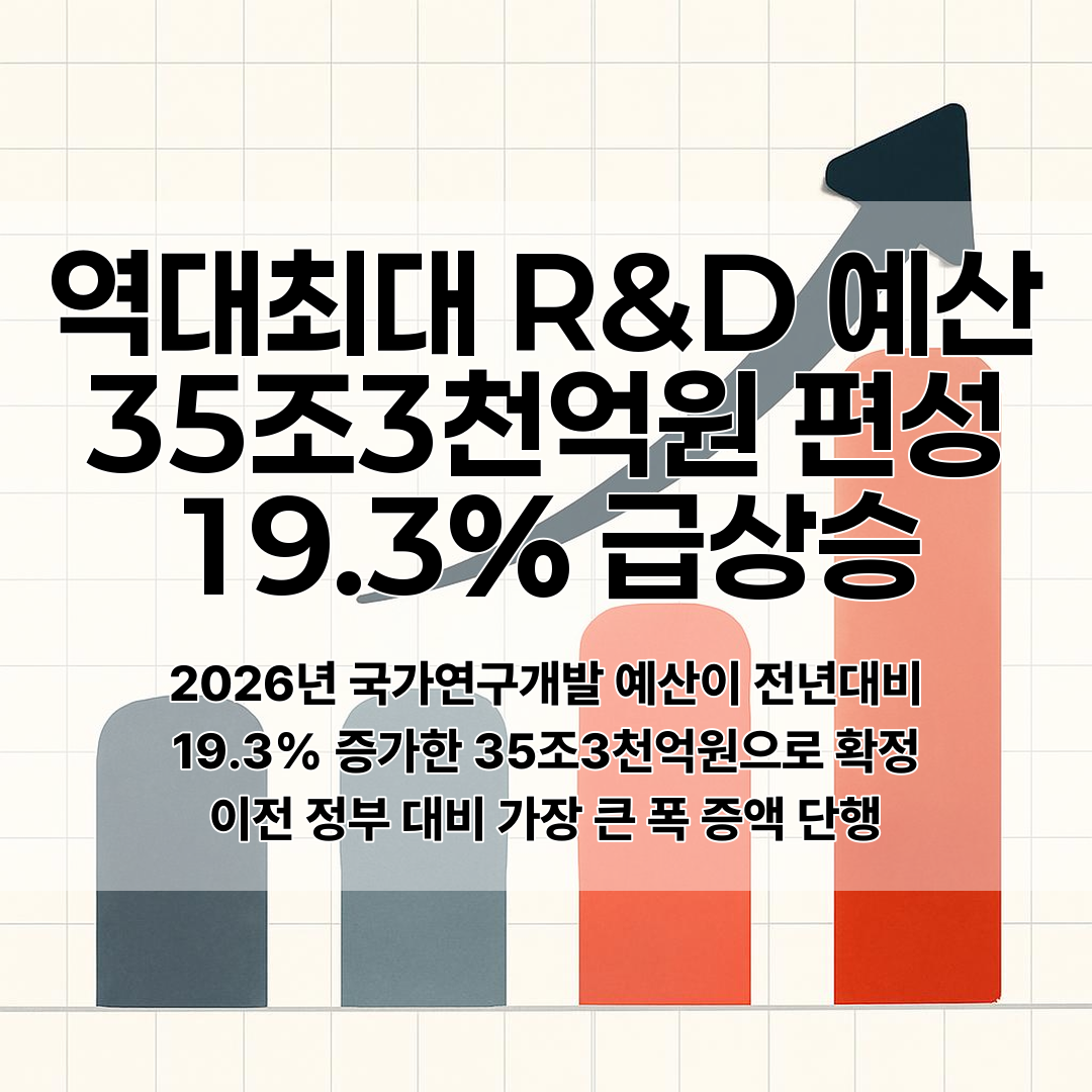 2026년 국가연구개발 예산이 전년 대비 19.3% 증가한 35조 3천억원으로 편성되어 역대 최대 규모를 기록했다.