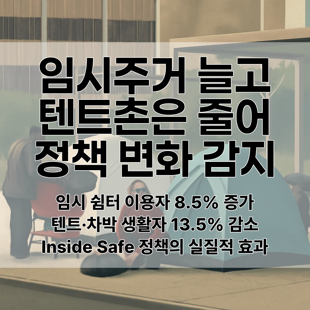 LA시의 임시 쉼터, 모텔, 타이니홈 등 이용자가 8.5% 증가한 반면, 자동차나 텐트, 임시 거처에서 생활하는 사람들은 13.5% 감소했다. Inside Safe, Pathway Home 등 텐트 해산 정책의 실질적 효과로 평가된다.