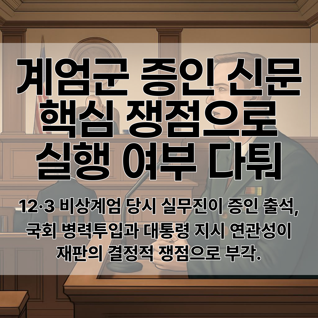 12·3 비상계엄 당시 계엄 실행에 관여한 계엄군과 실무자들이 증인으로 출석하여 국회 병력투입과 대통령 지시 연관성에 대한 증언을 진행하고 있으며, 이는 재판의 결정적 쟁점으로 작용하고 있다.