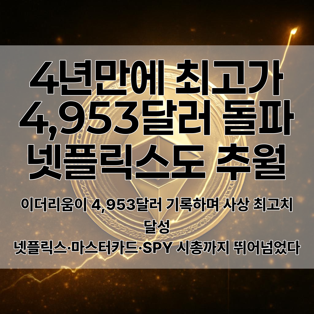 2025년 8월 25일 이더리움이 4,953달러를 기록하며 사상 최고치를 달성했다. 이는 2021년 11월 기록을 1,382일 만에 넘어선 것이며, 넷플릭스, 마스터카드, S&P500 ETF의 시가총액까지 뛰어넘었다.