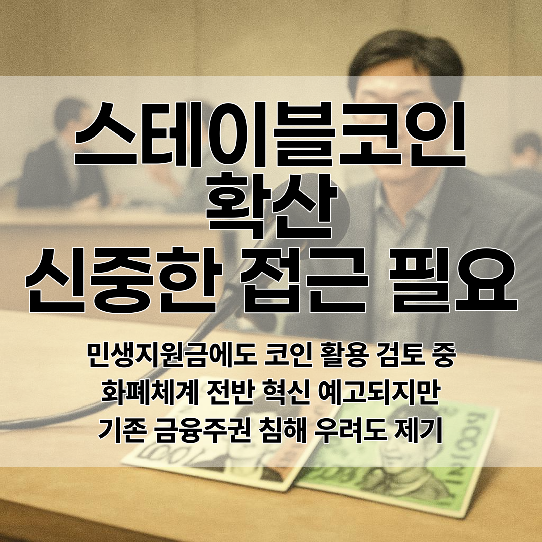 정부와 은행권이 민생회복지원금에 스테이블코인이나 CBDC 활용을 검토하고 있어 국민생활 전반의 화폐체계 혁신이 예고되고 있으나, 기존 금융주권 침해 우려가 제기되고 있다.