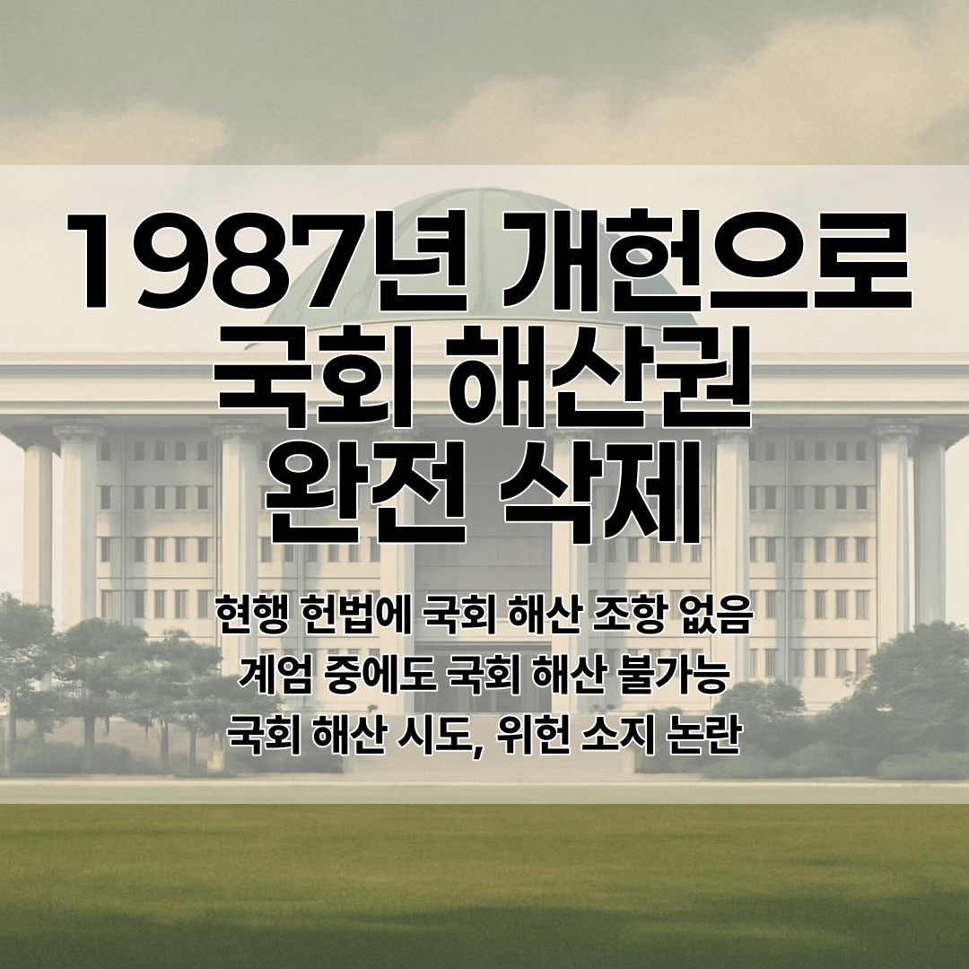 현행 대한민국 헌법에는 국회 해산에 대한 조항이 존재하지 않아요. 1987년 9차 개헌을 통해 국회 해산권이 명확하게 삭제된 거죠.