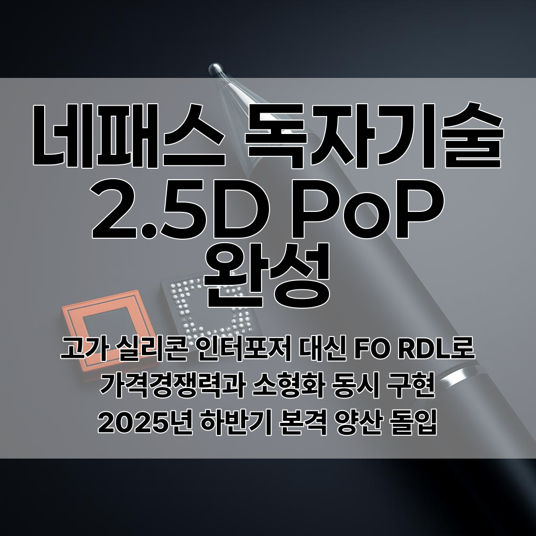 네패스가 고가 실리콘 인터포저 대신 팬아웃(FO) RDL 인터포저를 사용한 패키지온패키지(PoP) 형태의 2.5D 첨단 패키징 기술을 자체 개발했으며, 2025년 상반기 고객사 개발 완료 후 하반기 본격 양산 예정이다.