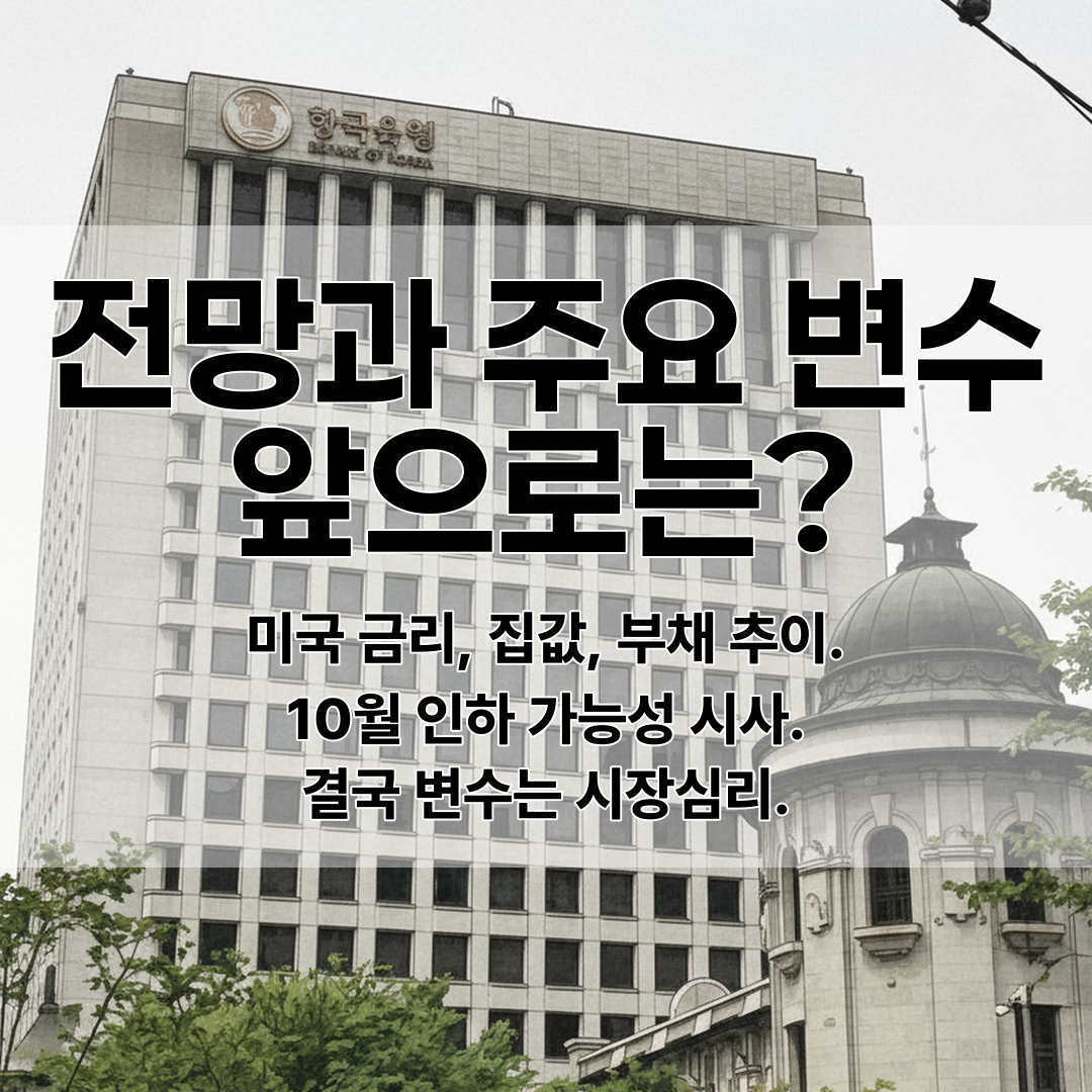 금통위 일부는 10월 이후 인하 가능성을 언급했지만, 집값 불안과 가계부채가 완전히 잡혀야 한다는 조건이 붙었어요.