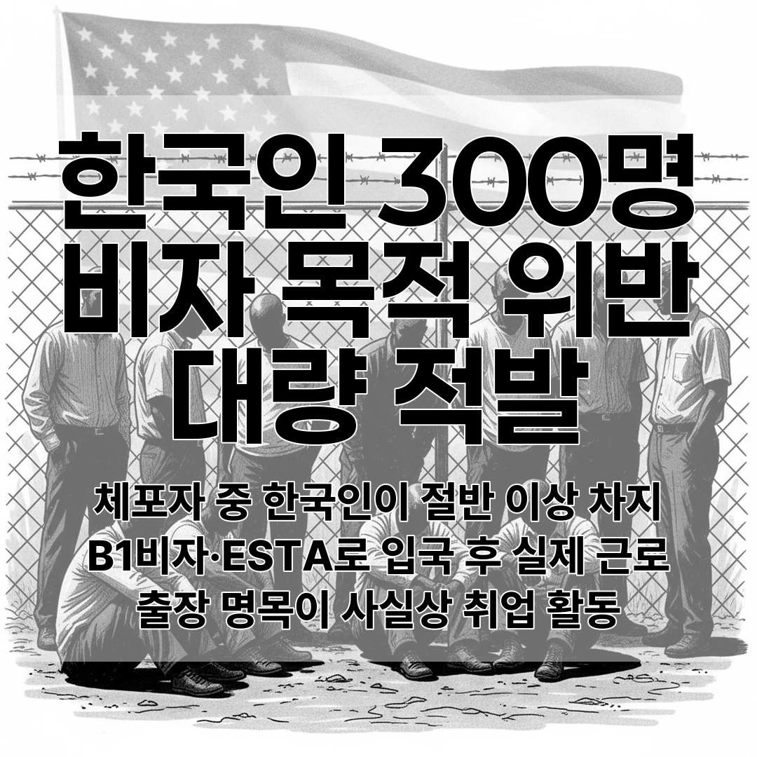 체포된 475명 중 300여 명이 한국인으로, 대부분 B1 비자나 ESTA로 입국 후 출장 명목이 아닌 실질적인 근로 활동에 참여해 체류 목적 위반으로 적발되었다.