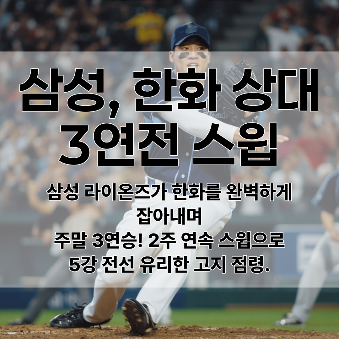 삼성 라이온즈가 한화전 압승과 주요 선수들의 활약으로 5강 경쟁 구도를 유리하게 이끌고 있습니다.