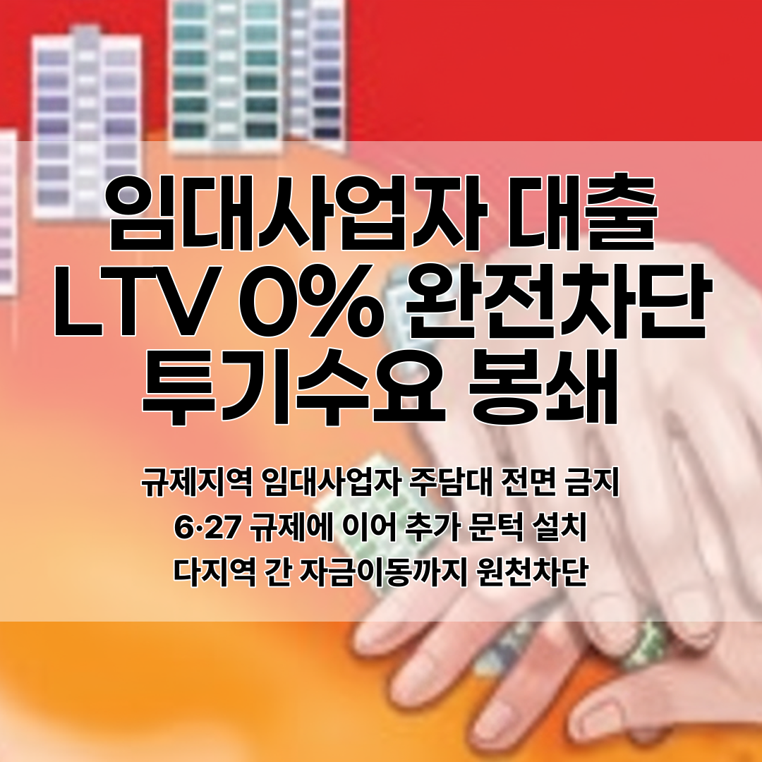 이번 규제의 핵심은 규제지역 내 임대사업자의 주택담보대출을 완전히 차단(LTV 0%)하는 거예요. 6·27 부동산 규제에 이어 또 다른 강력한 조치가 나온 셈이죠. 🚫