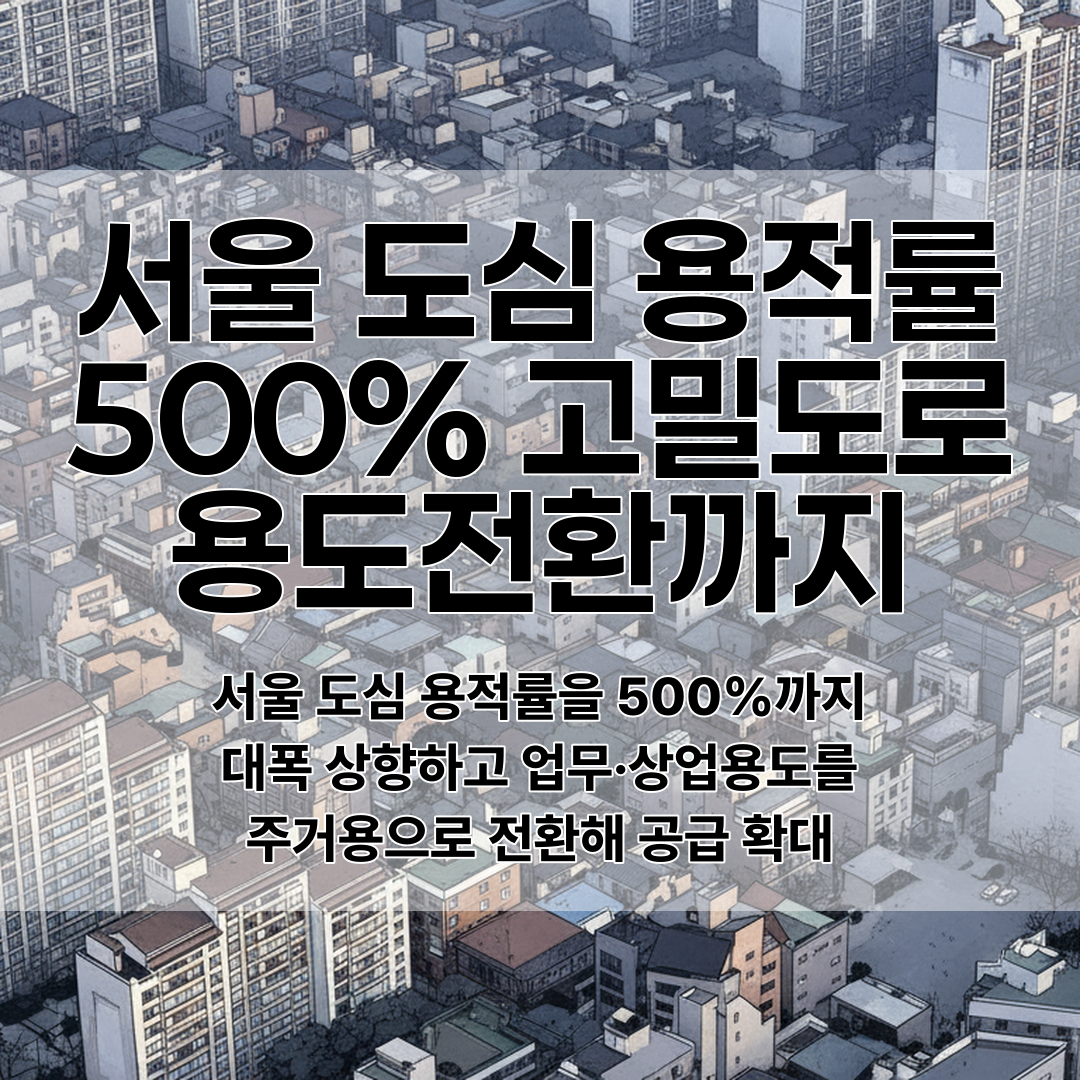 서울 도심 개발 방식도 완전히 바뀝니다. 기존 건물들의 용적률을 500%까지 대폭 올려서 고밀도 개발을 추진해요.