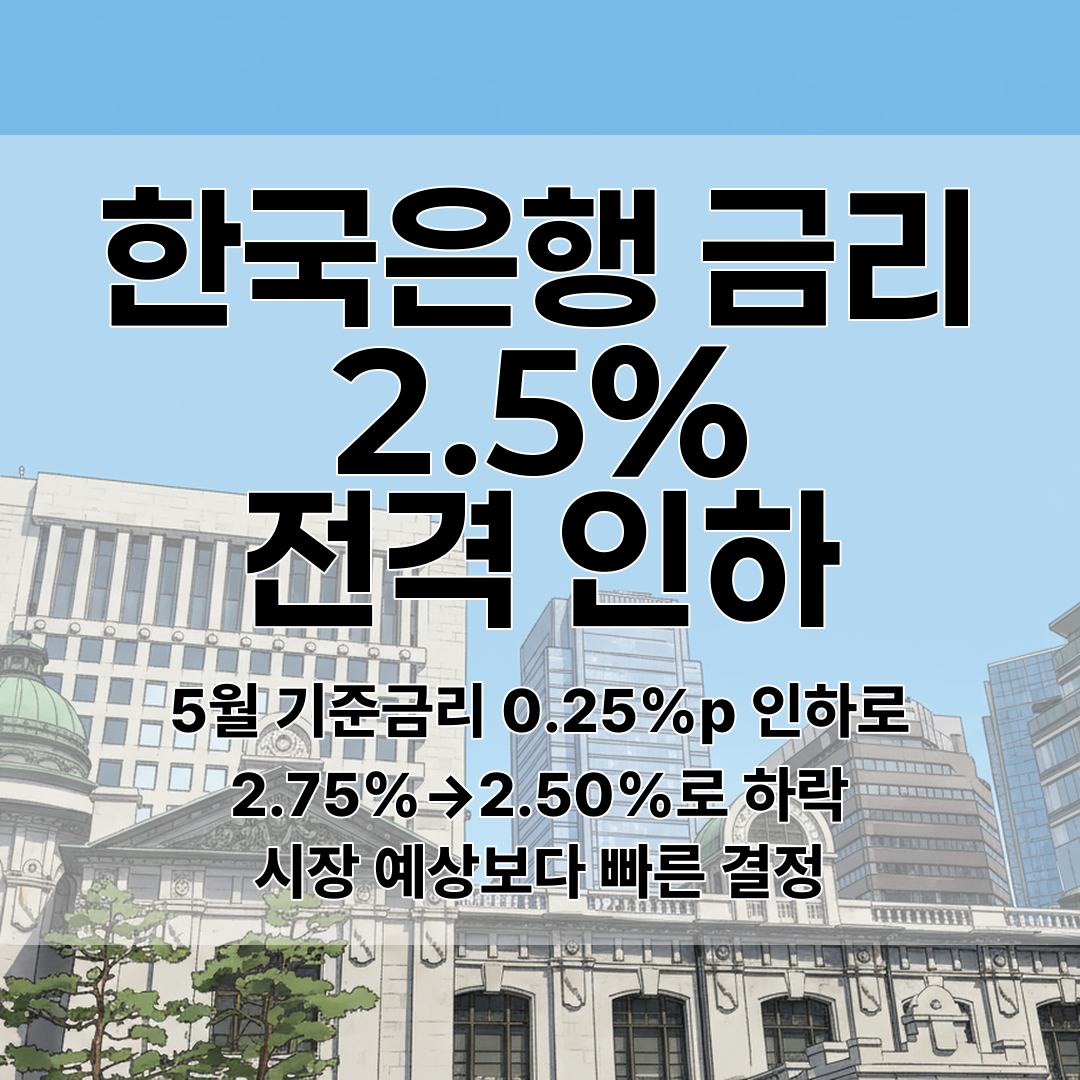 2025년 5월 29일 한국은행 금융통화위원회가 기준금리를 2.75%에서 2.50%로 0.25%포인트 인하 결정. 올해 두 번째 금리 인하로 시장 예상보다 빠른 결정이었음.