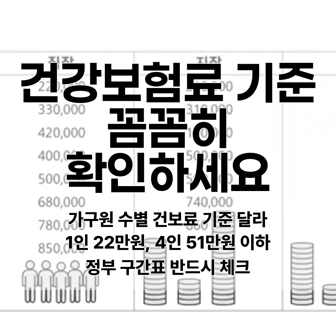 1인 가구는 월 22만원 이하, 4인 가구는 51만원 이하로 가구원 수에 따라 건강보험료 기준이 달리 적용되며, 다소득원 가구는 가구원 수 1명 추가 적용된다.