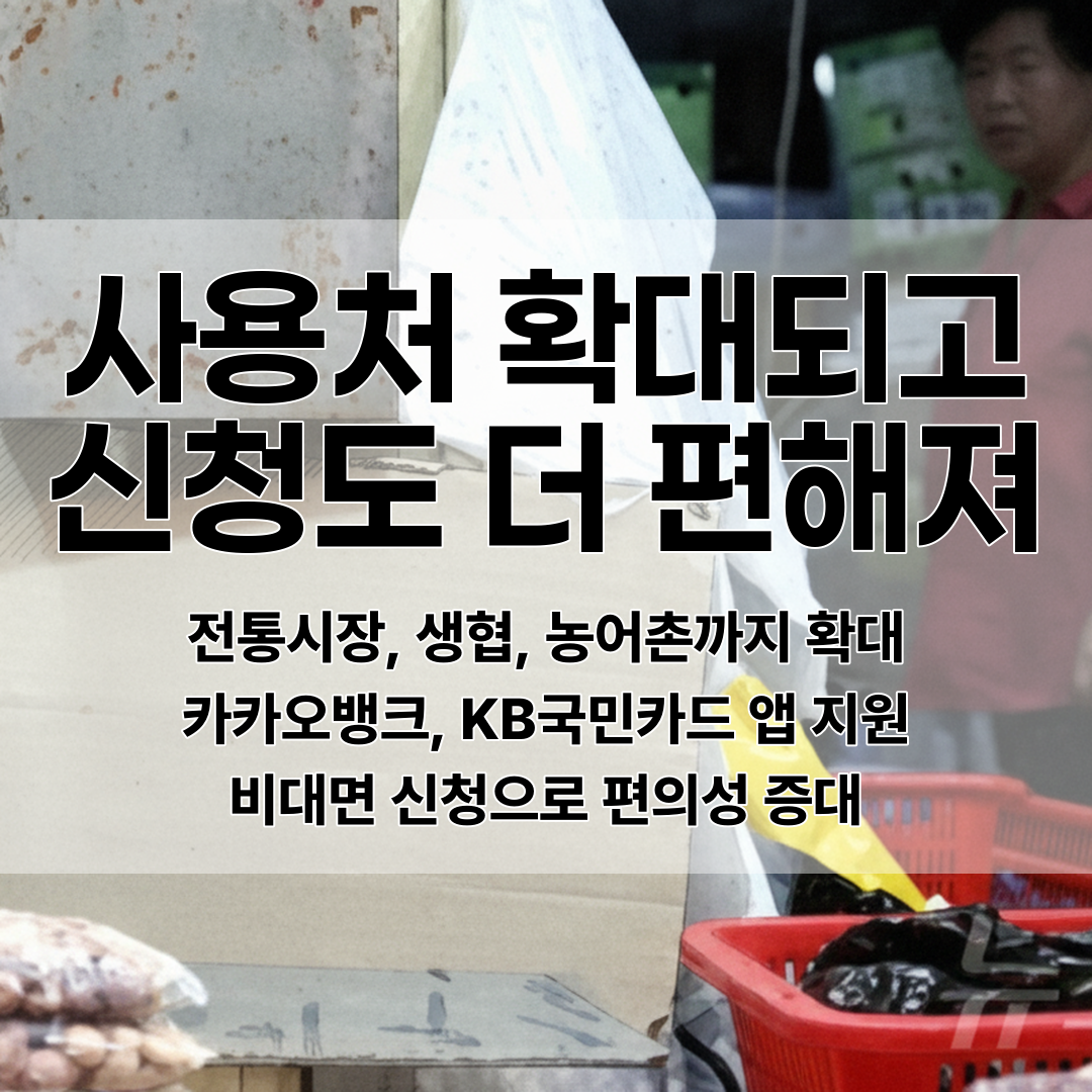 전통시장, 지역생협, 농어촌 마트까지 사용처가 확대되었으며, 카카오뱅크와 KB국민카드 앱을 통한 비대면 신청이 가능해졌다.
