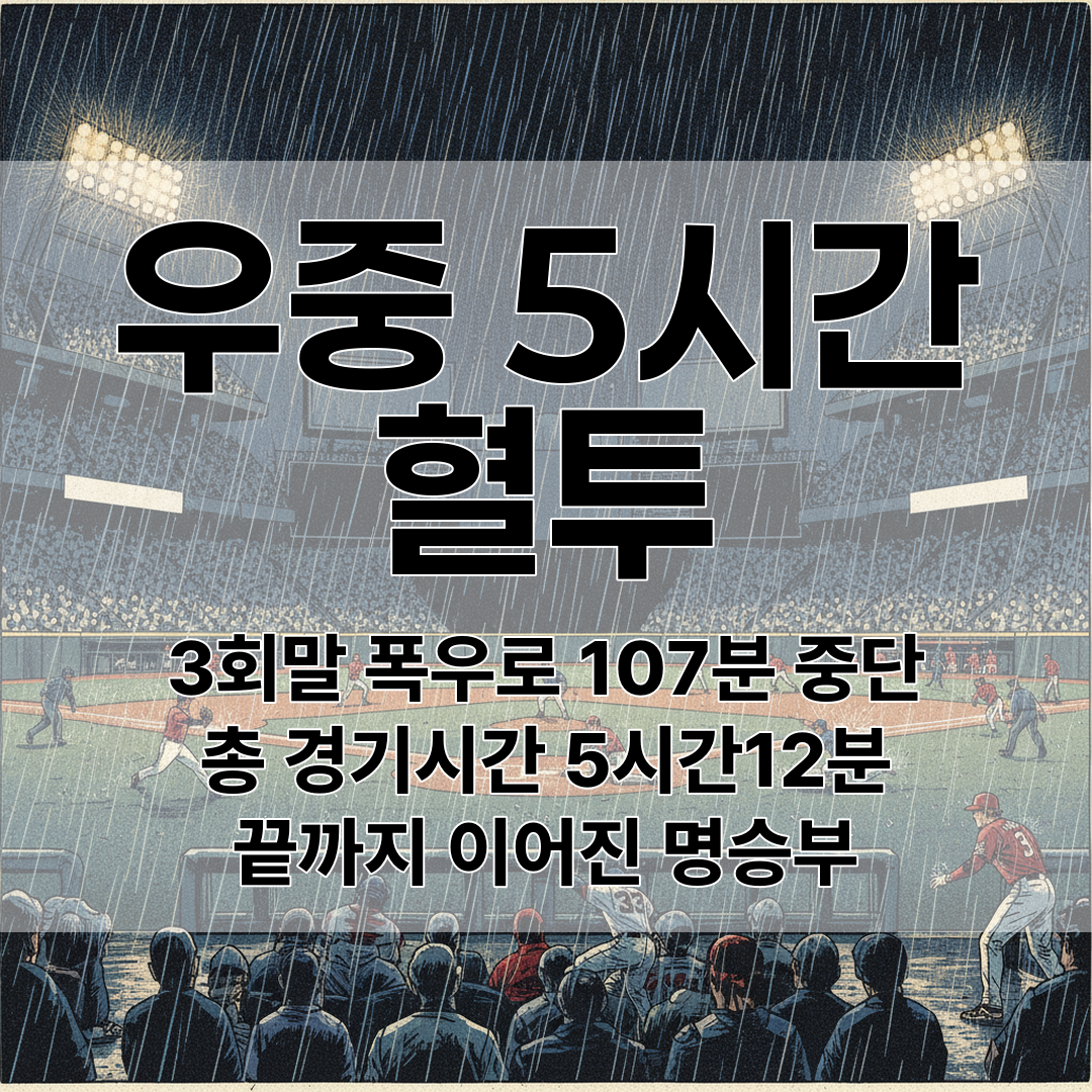 이날 경기는 정말 드라마틱했어요. 3회말 갑작스런 폭우로 무려 1시간 47분이나 중단되는 상황이 벌어졌거든요! 🌧️