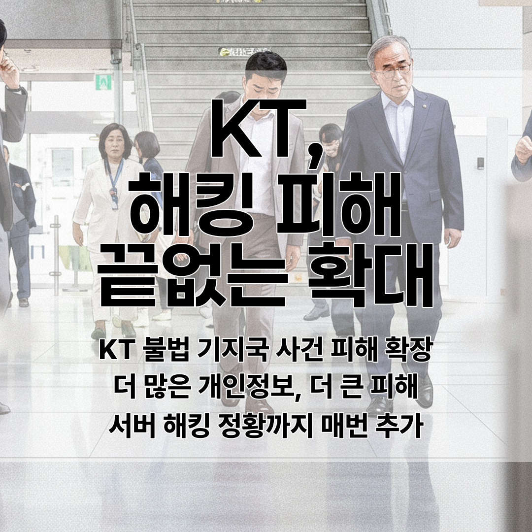 KT는 불법 초소형 기지국을 통한 무단 소액결제 피해자 수와 피해액이 계속 증가하고 있으며, 개인정보 유출 항목도 지속적으로 늘어나고 있고 서버 해킹 흔적까지 발견되었다.