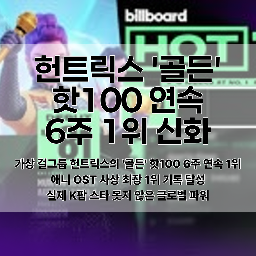 작품 속 가상 걸그룹 '헌트릭스'가 부른 주제곡 '골든'이 빌보드 싱글차트 '핫100'에서 무려 6주 연속 1위를 차지했거든요. 이는 애니메이션 OST 역사상 가장 긴 1위 기록이에요!