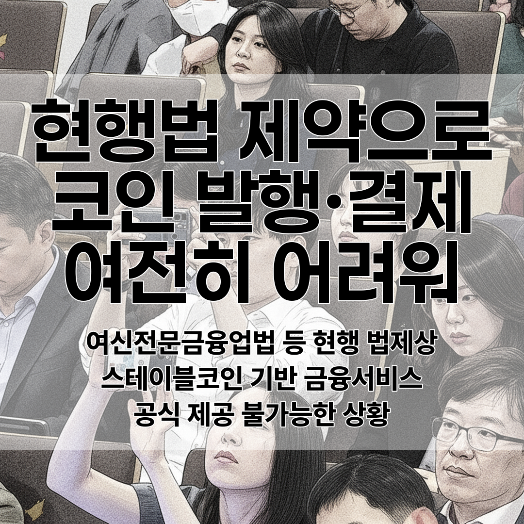 여신전문금융업법 등 현행 법제상 스테이블코인 기반 금융서비스의 공식 제공이 불가능한 상황으로, 코인 발행 및 결제에 법적, 제도적 한계가 존재하고 있다.