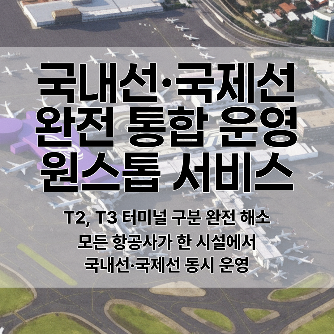 지금까지 국내선과 국제선을 따로 이용해야 했던 불편함이 완전히 사라집니다! 기존 T2, T3 터미널 구분이 없어지고, 새로 건설되는 통합 터미널에서 모든 항공편을 이용할 수 있게 돼요.