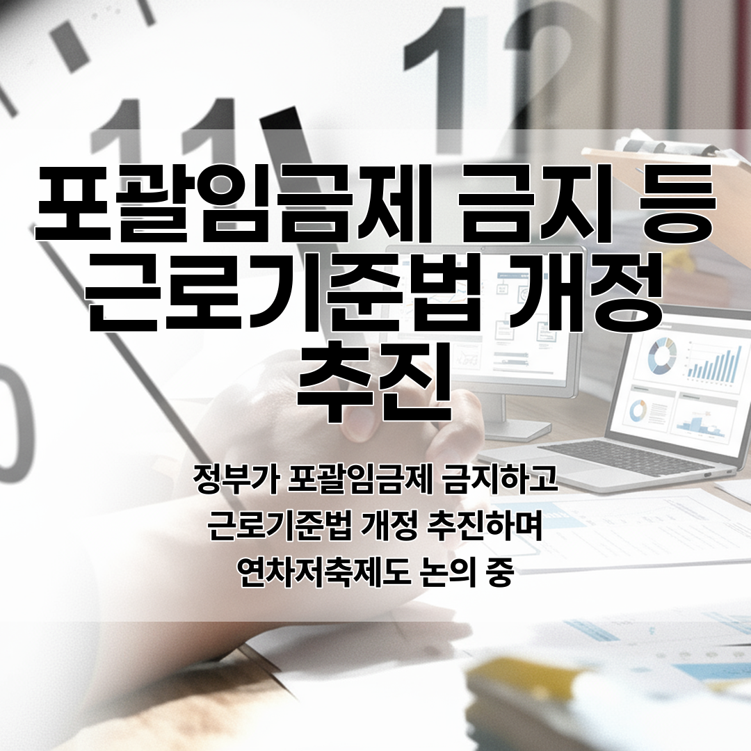 정부가 포괄임금제 제한, 연차휴가 활성화, 연차저축제 도입 등을 포함한 근로기준법 개정을 추진하고 있으며, 2028년쯤 법정 노동시간 단축도 고려 중이다.
