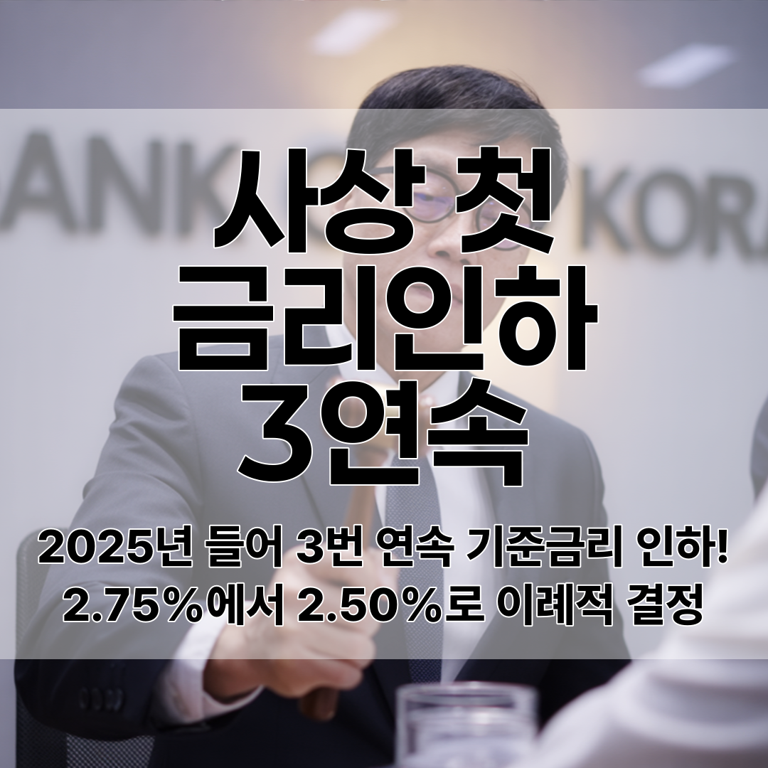 2025년 들어 한국은행이 기준금리를 세 번 연속 인하하여 2.75%에서 2.50%로 조정했으며, 이는 2022년 금리 인상 사이클 이후 가장 빠른 속도의 완화정책이다.