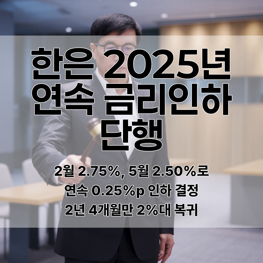 한국은행이 2025년 들어 파격적인 금리 인하 행보를 보이고 있어요. 2월 25일 금융통화위원회에서 기준금리를 2.75%로 0.25%포인트 내린 데 이어, 불과 3개월 뒤인 5월 29일 또다시 0.25%포인트를 추가로 인하해 2.50%로 결정했습니다.
