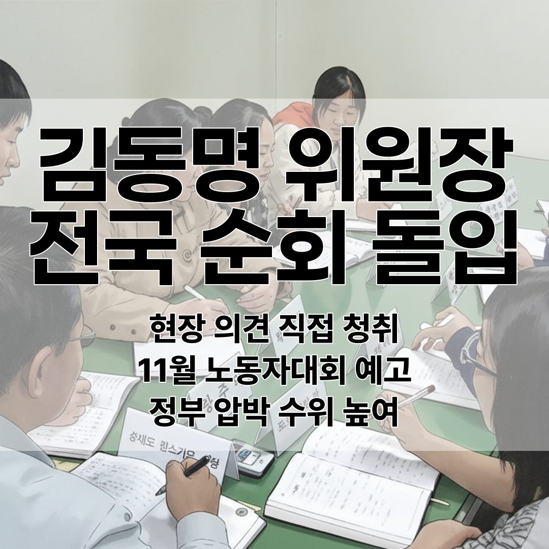 김동명 한국노총 위원장이 전국 순회를 통해 현장 노동자 의견을 직접 청취하겠다고 발표했으며, 11월 8일 전국노동자대회를 예고하여 정부와 국회를 향한 압박 수위를 높였다.