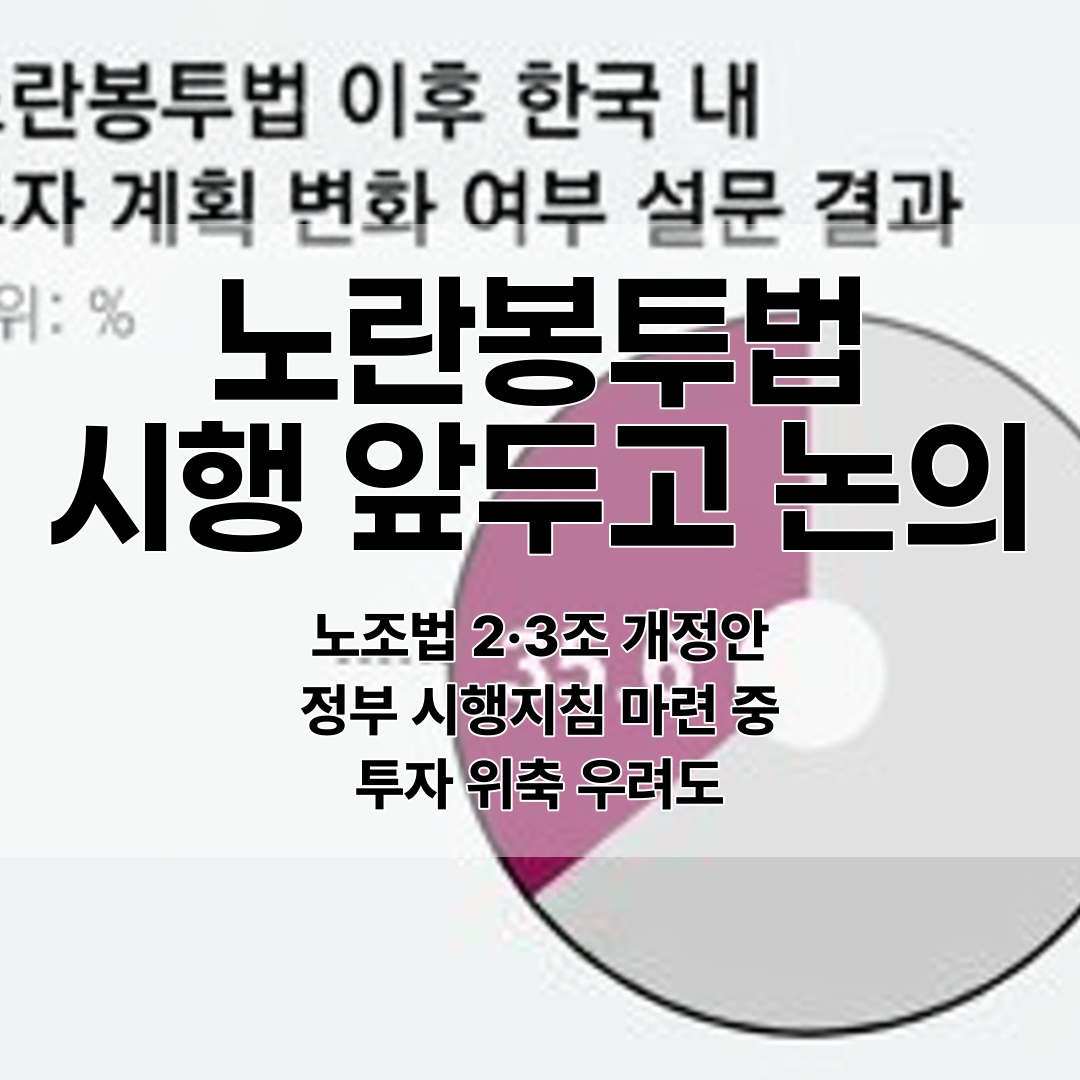 국회를 통과한 노조법 2·3조 개정안(노란봉투법)의 구체적 시행 방안이 논의되고 있으며, 정부는 세부 시행 지침을 마련 중이다. 경제계는 과도한 노동권 보장으로 인한 투자 환경 악화를 우려하고 있으며, 외국인 투자기업 3분의 1이 투자 축소를 검토 중이라는 조사 결과가 나왔다.