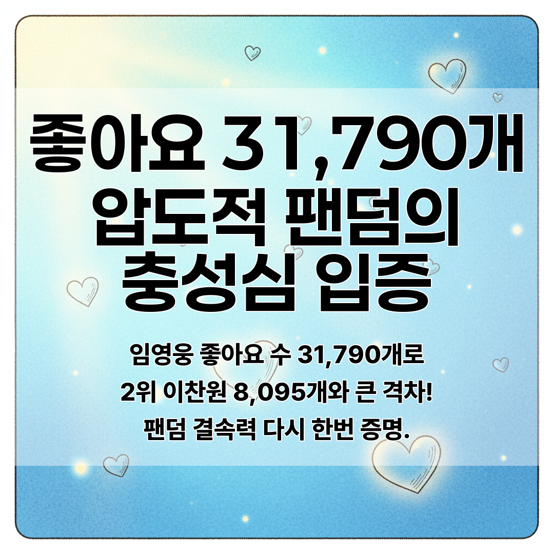 무려 31,790개의 좋아요를 받으며 압도적 1위를 기록했습니다. 2위 이찬원(8,095개), 3위 영탁(2,012개)과 비교해보면 그 차이가 정말 엄청나죠.
