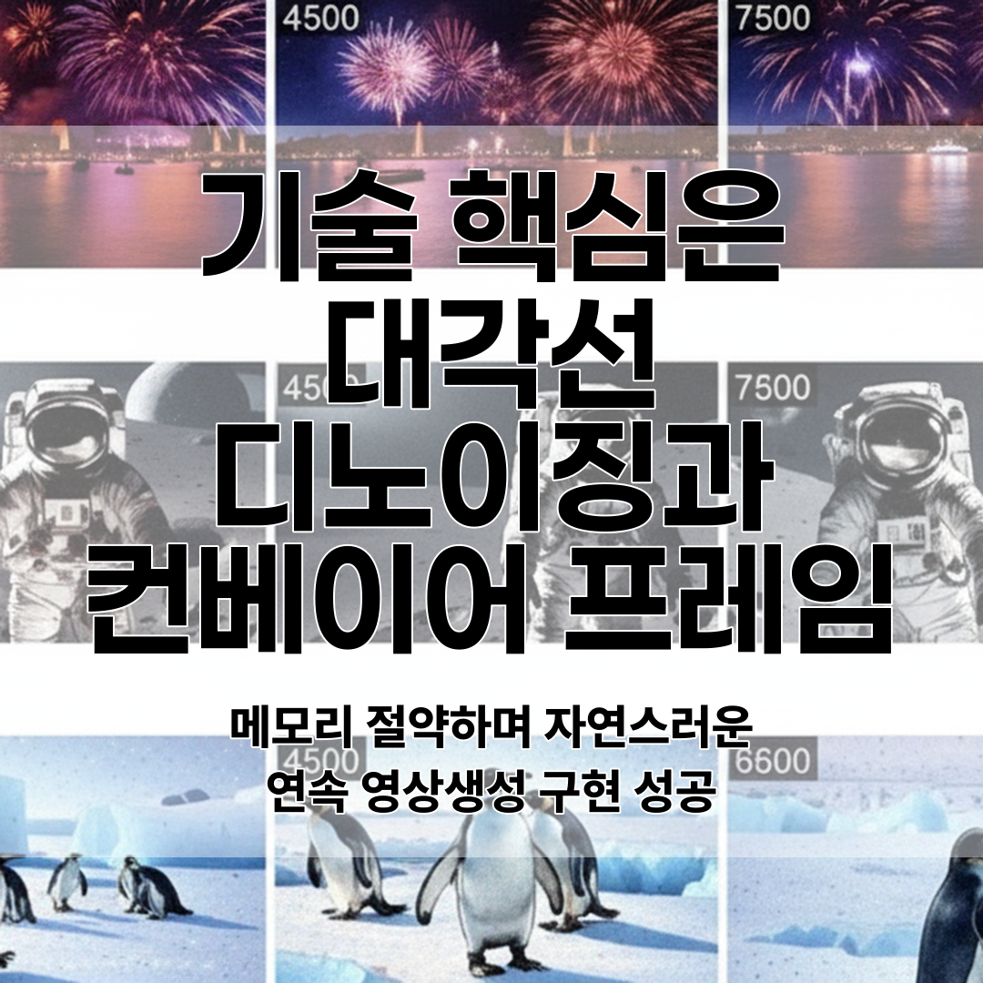 컨베이어 벨트처럼 프레임을 배치해서 앞서 생성한 프레임들을 순차적으로 연결하는 방식이죠. '잠재 구간 분할'로 긴 시퀀스를 작은 단위로 처리해 안정성과 화질을 동시에 잡았어요.
