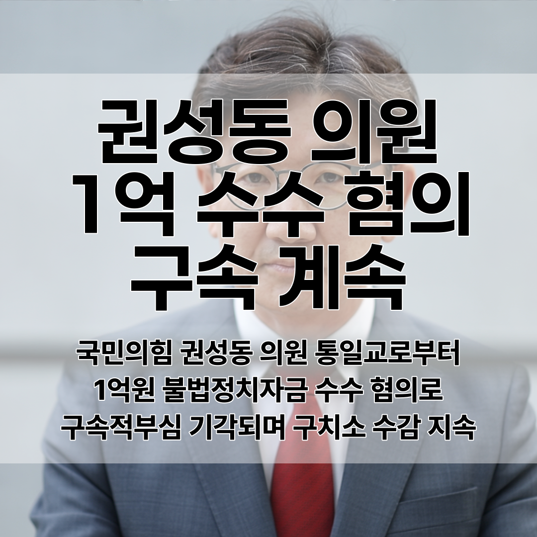국민의힘 권성동 의원이 통일교로부터 1억원 불법 정치자금 수수 혐의로 구속된 가운데, 구속적부심이 기각되어 계속 구치소에 수감되게 되었다. 법원은 혐의의 중대성과 증거인멸 우려를 종합 고려하여 구속 상태 유지를 결정했다.