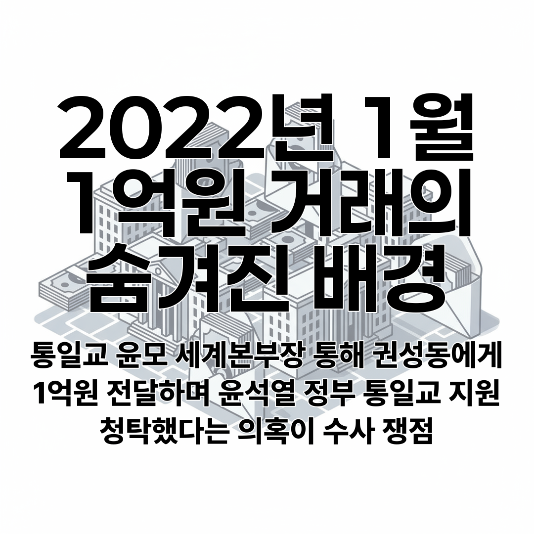 통일교 윤모 세계본부장이 2022년 1월 권성동 의원에게 1억원을 전달하면서 윤석열 정부에서 통일교에 대한 우호적 정책을 요청했다는 의혹이 수사의 핵심이다. 당시는 윤석열 정부 출범 준비 시기였다.