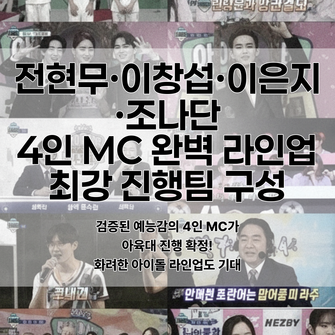 아육대 MC진이 화려하게 구성됐어요! 전현무, 비투비 이창섭, 이은지, 조나단이 진행을 맡게 됐습니다. 🎤