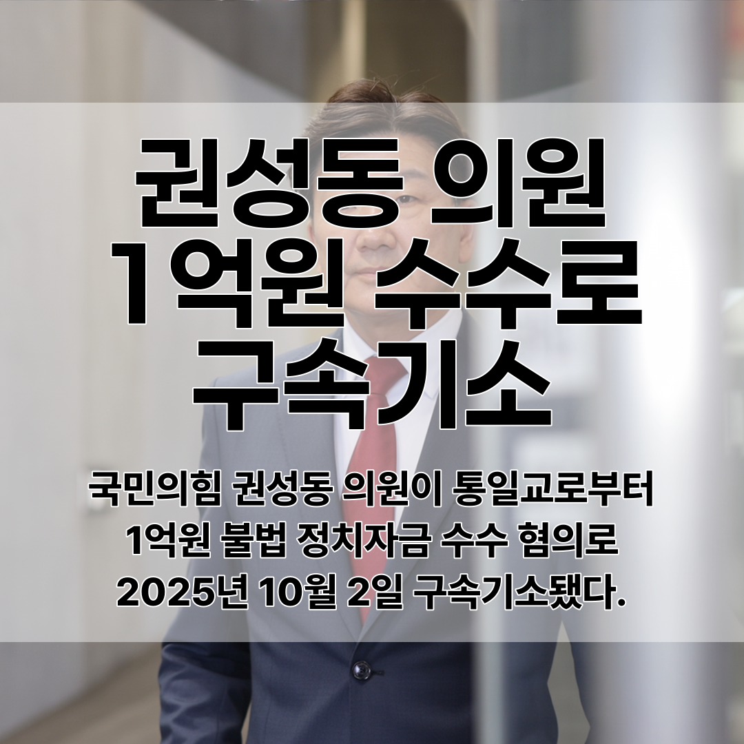 국민의힘 권성동 의원이 2022년 대선 당시 통일교로부터 1억원의 불법 정치자금을 받은 혐의로 2025년 10월 2일 구속기소되었다. 현직 국회의원이 특검에 의해 구속된 매우 이례적인 사건이다.