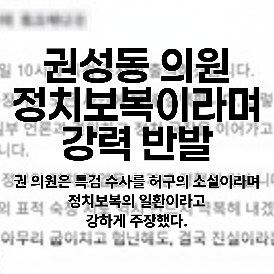 권 의원은 특검이 진실이 아닌 허구의 시나리오를 만들고 있다며, 이번 수사가 정치보복의 일환이라고 주장했습니다. SNS를 통해서도 본인의 결백을 강조하며 끝까지 진실을 증명하겠다고 밝혔죠.