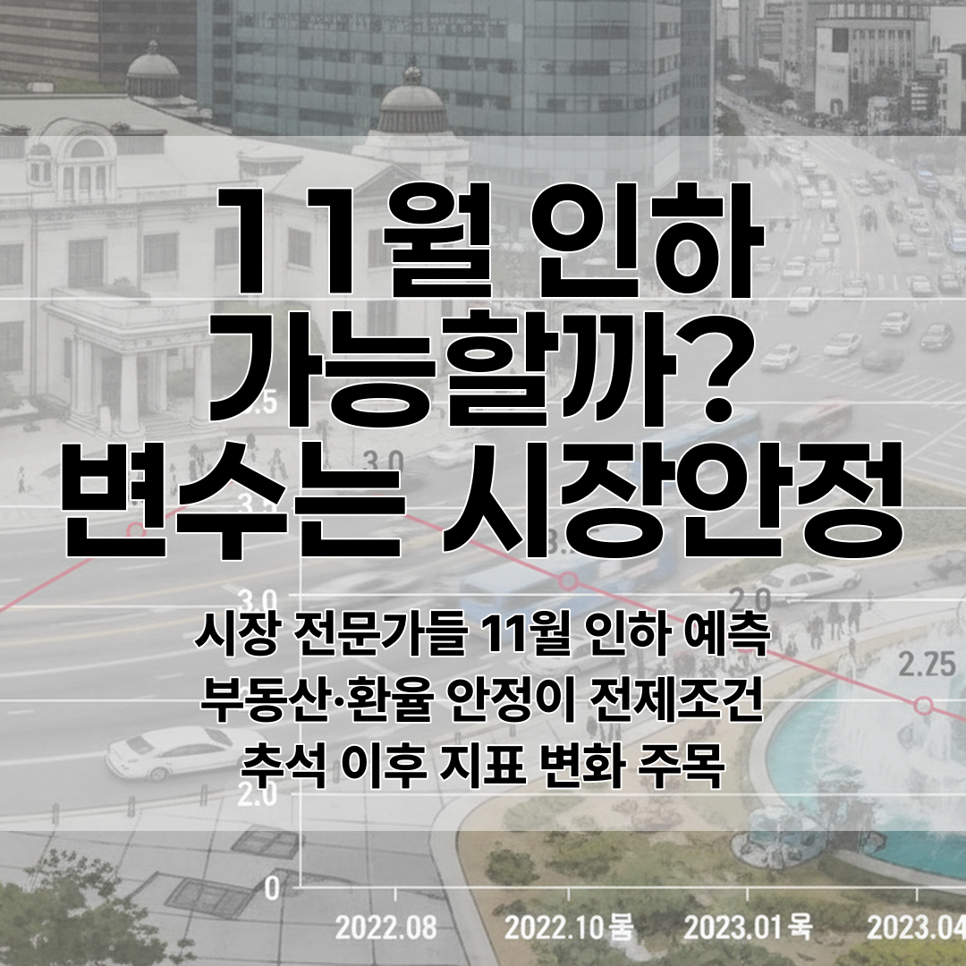 시장 전문가들은 11월 금리 인하 가능성에 무게를 두고 있지만, 부동산·환율 안정이 전제조건이다. 추석 이후 소비 패턴, 부동산 시장 동향, 환율 변동성 진정 등이 중요한 변수로 작용할 것으로 예상된다.