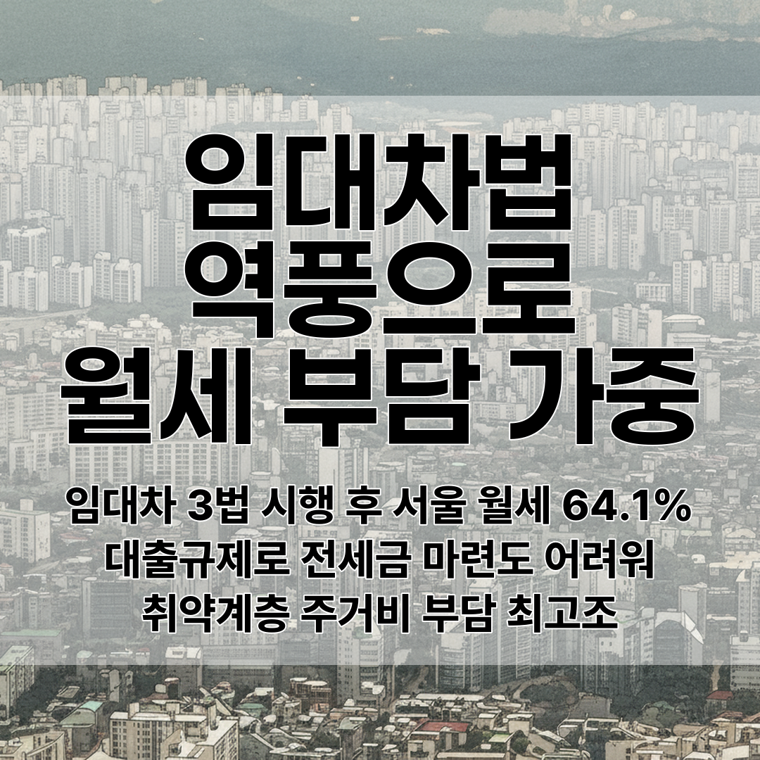 임대차 3법 시행 후 서울 월세 비중이 64.1%까지 상승했다. 계약갱신청구권과 전월세상한제, 강화된 대출 규제로 인해 전세금 마련이 어려워지면서 정책 취지와 반대로 서민들의 주거비 부담이 증가했다.